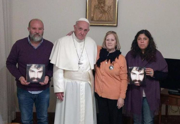 El encuentro se produjo en el marco de una audiencia privada en la residencia de Santa Marta. «Muy emocionante», aseguraron desde el entorno familiar del joven muerto en el marco de un operativo represivo de Gendarmería contra la comunidad mapuche. Los detalles de la palabra de Francisco. A pesar de la fuerte campaña mediática en desprestigio del caso Santiago Maldonado, el Papa Francisco lanzó un fuerte gesto y recibió en el Vaticano a la familia del joven de 28 años hallado muerto en el río Chubut tras 78 días de búsqueda y luego de haber sido víctima el 1° de agosto durante de un violento operativo represivo de Gendarmería Nacional en la comunidad mapuche de la localidad chubutense de Cushamen.El Sumo Pontífice mantuvo un «encuentro privado» con Sergio, el hermano del joven tatuador, su esposa, Andrea Antico, y su madre, Stella Maris Peloso. Ocurrió en la sede ede de Santa Marta. «Fue un encuentro emocionante. El Papa nos demostró que conocía el caso Santiago con muchos detalles y se comprometió a acompañar a la familia en su reclamo por verdad y justicia», expresó un allegado a la familia Maldonado, según Clarín. Culminado el encuentro en el Vaticano, la familia Maldonado difundió un comunicado en el que agradeció al Sumo Pontífice: «Con profunda emoción, aún conmovidos, comunicamos que hoy fuimos recibidos por el Papa Francisco en una audiencia privada. Recibimos su apoyo personal, afectuoso y sincero a nuestro pedido por Verdad y Justicia para Santiago». «Destacó la dignidad de nuestra familia en el reclamo, la convicción de actuar desde y para la Paz aún siendo objeto de agresiones y violencias. Valoramos su compromiso sostenido y su compasión hacia quienes sufrimos la pérdida de un ser querido en circunstancias terribles», dijeron. El Papa ya se había mostrado cerca de la familia Maldonado, apenas se conoció la muerte del joven. Francisco les había enviado una carta en la que les expresó su apoyo. «En estos momentos de tanto dolor y tristeza, le hago llegar la seguridad de mi cercanía y oración», le manifestó Su Santidad en el texto. Tras su visita al Vaticano, mañana Sergio Maldonado participará de una charla abierta sobre derechos humanos junto a Taty Almeida, de Madres de Plaza de Mayo y Charly Pisoni, de H.I.J.O.S. Capital, bajo la consigna: «Los DD HH en tiempos de Macri, el gobierno de las multinacionales: Benetton en tierras mapuches». Foto: Política Argentina