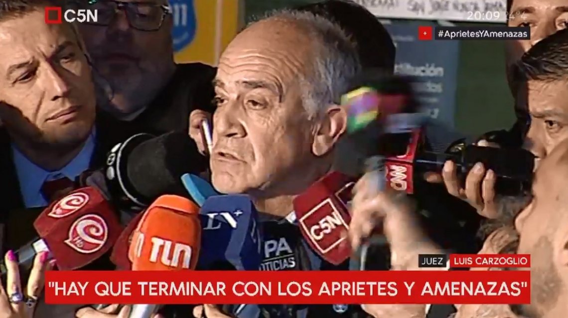 El juez Luis Carzoglio, quien denegó el pedido de detención de Pablo Moyano, cargó con dureza contra varios medios de comunicación y reconocidos periodistas por presionar para influir en sus resoluciones. El juez Luis Carzoglio denegó este martes el pedido de detención de Pablo Moyano formulado por el fiscal Sebastián Scalera y cargó con dureza contra la Procuración General de la provincia de Buenos Aires y varios medios de comunicación y reconocidos periodistas a los que acusó de difamarlo y presionarlo para intentar torcer sus resoluciones. «No me dejé llevar por las presiones de ninguna de las partes y no me dejé presionar por la campaña de prensa llevada a cabo por el Grupo Clarín y La Nación» disparó el magistrado en una improvisada conferencia de prensa. Carzoglio confirmó que esta mañana recibió dos amenazas de muerte una vez que se filtrara en los medios que iba a denegar el pedido de detención de Moyano y detalló: «llamaron dos veces, atendió mi mujer, la amenazaron de muerte a ella y a mí e hicieron alusión a los problemas físicos que padece ella lo que evidencia que tenían información precisa sobre nosotros». «A mí, como juez, no me van apretar ni a perseguir con estos carpetazos, con este tipo de maniobras. Acá se tiene que terminar con los aprietes, las amenazas y el pertubar la acción de la justicia » siguió Carzoglio. Fuente: https://www.minutouno.com