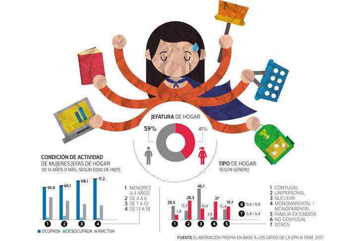 La proporción mayoritaria de mujeres como jefas de hogar también se evidencia en las «familias extendidas», una categoría que corresponde a aquellos casos en los que al núcleo estereotipado de padre, madre e hijos se les suman tíos, abuelos u otras personas al cuidado. Esto demuestra la responsabilidad mayor que asume la mujer, pero también amplía la brecha de la desigualdad. Porque como describe el boletín, «la presencia de las mujeres en el mercado laboral se ve afectada por la carga del trabajo doméstico y de cuidados que recae sobre ellas». Mientras que los jefes de hogar hombre tienen un desempleo que oscila entre el 1% y el 3%, las jefas de hogar mujeres tienen un desempleo promedio del 39% cuando los hijos son menores a 4 años y alcanza el 25% cuando los hijos son la adolescentes.