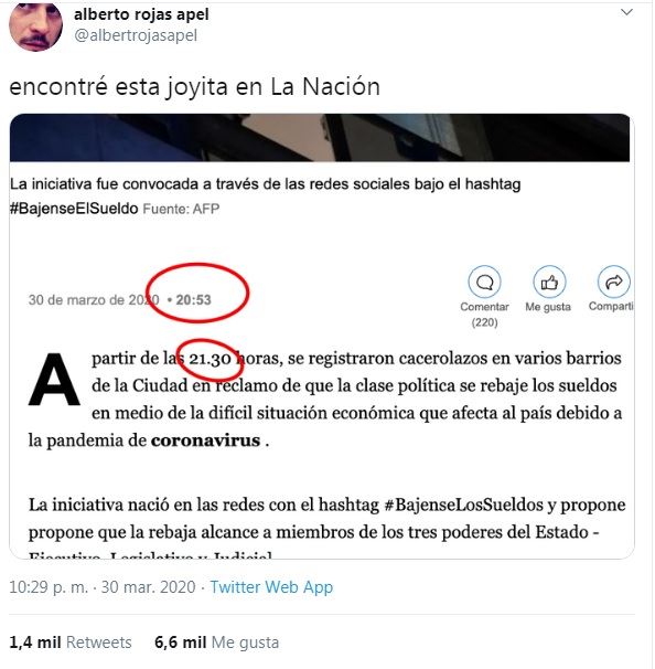 La Nación publicó los cacerolazos en pasado antes de que ocurran.
