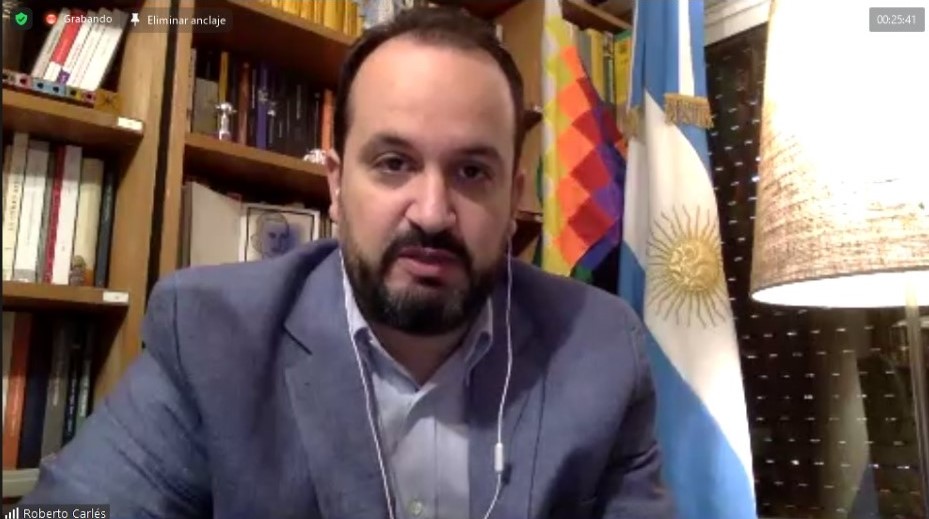 Fotografía de Robert Carles, embajador argentino en Italia, durante la videoconferencia