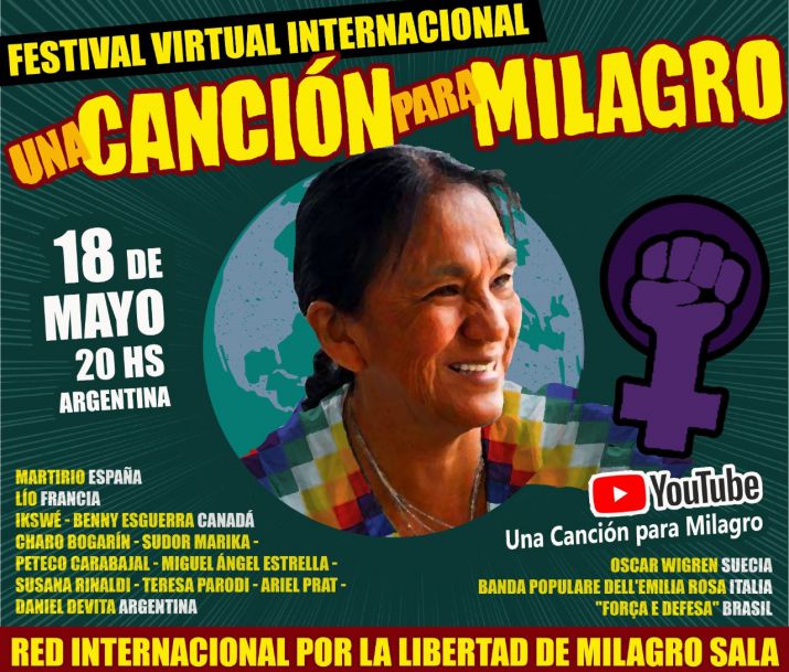 El próximo martes 18, la Red Internacional por la Libertad de Milagro Sala, organiza el Festival Internacional UNA CANCIÓN PARA MILAGRO. El encuentro contará con la participación de varios artistas y su objetivo es exigir la libertad de la lideresa social jujeña, arbitrariamente detenida desde hace más de 5 años.