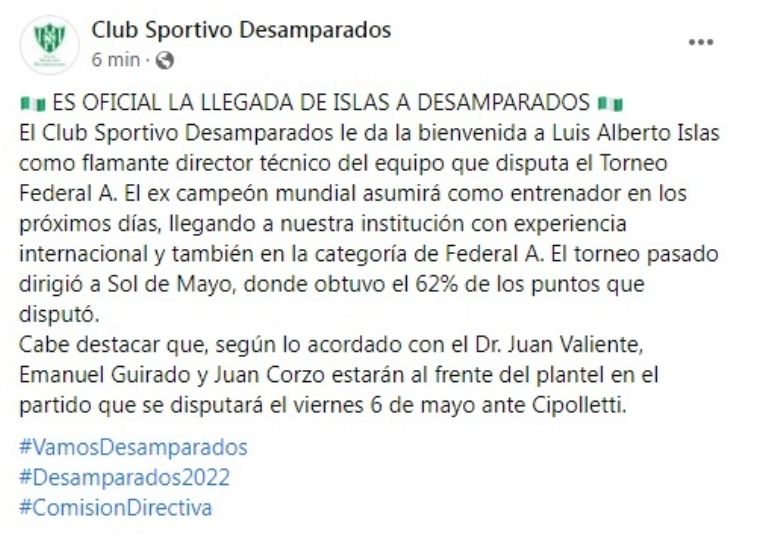 «El Club Sportivo Desamparados le da la bienvenida a Luis Alberto Islas como flamante director técnico del equipo que disputa el Torneo Federal A. El campeón mundial asumirá como entrenador en los próximos días, llegando a nuestra institución con experiencia internacional y también en la categoría de Federal A. El torneo pasado dirigió a Sol de Mayo, donde obtuvo el 62% de los puntos que disputó», señaló el mensaje oficial en redes sociales.