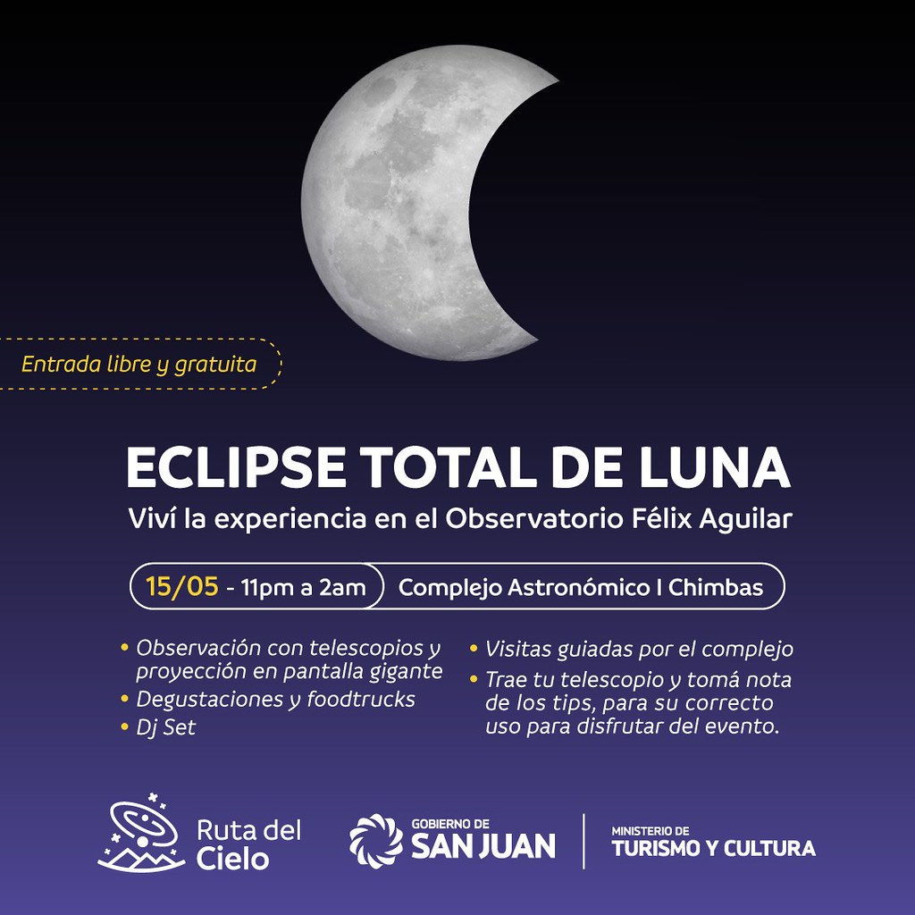 Este 15 de mayo, en el cielo sanjuanino se podrá observar el eclipse lunar total, un fenómeno que no se repetirá hasta marzo del 2025. En este contexto, el Observatorio Félix Aguilar abrirá sus puertas al público para vivir una noche imperdible.