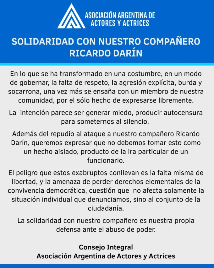 En ese contexto, en el que resonó fuerte la reacción del ministro de Economía Luis «Toto» Caputo, el Consejo Integral de la Asociación Argentina de Actores y Actrices emitió un duro comunicando respaldando al reconocido actor.