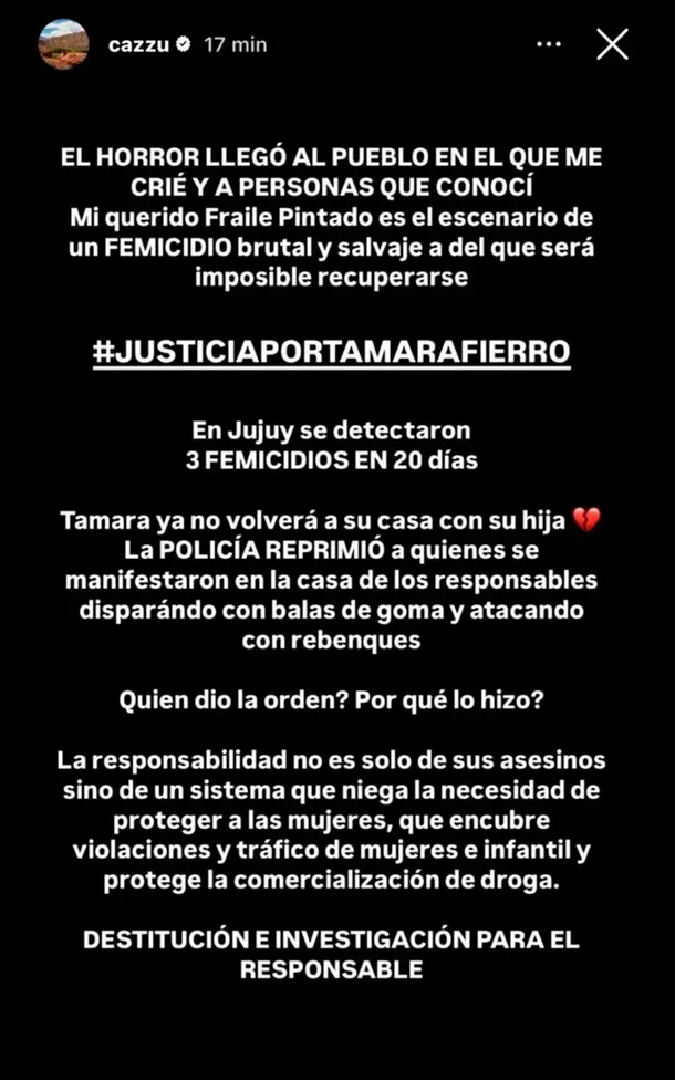 La artista utilizó sus redes sociales para denunciar el crimen, visibilizar la violencia de género que azota a Jujuy y repudiar la represión policial sufrida por vecinos y familiares que se manifestaron exigiendo justicia. “Nos matan y encima nos reprimen cuando salimos a gritar que nos están matando”, escribió con furia y angustia.