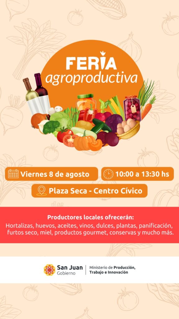Este viernes 8 de agosto, la Plaza Seca del Centro Cívico volverá a convertirse en un espacio de encuentro entre la comunidad sanjuanina y los pequeños productores locales. Desde las 10 hasta las 13 horas, se desarrollará una nueva edición de la Feria Agroproductiva, una iniciativa que reúne a más de 80 expositores provenientes de distintos puntos de la provincia.