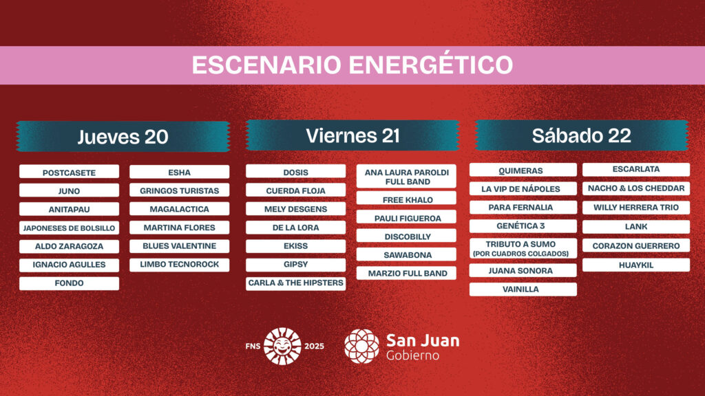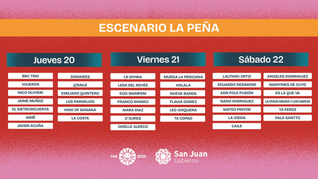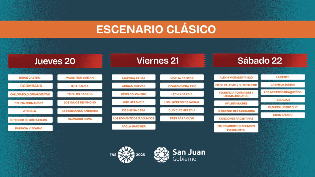 El predio contará nuevamente con tres escenarios temáticos, La Peña dedicado al folclore, el cuarteto y la cumbia, este espacio celebrará las raíces, las costumbres y la tradición musical sanjuanina. Energético, pensado para el rock, pop, urbano, indie y reggae, será el escenario que represente la fuerza de las bandas emergentes y la energía creativa de las nuevas generaciones de artistas locales. El Clásico reunirá a grupos que son verdaderas leyendas en la provincia, junto con clásicos de todos los tiempos.