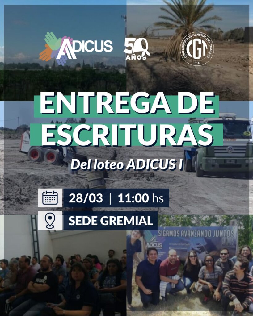 La entrega de escrituras fue hoy sábado 28 de marzo a las 11hs en la sede gremial ubicada en calle España 510 Sur. Se hicieron entrega de las escrituras a los propietarios de terrenos en el proyecto «ADICUS 1». El mencionado proyecto está ubicado en calle La Troja, departamento Rawson.
