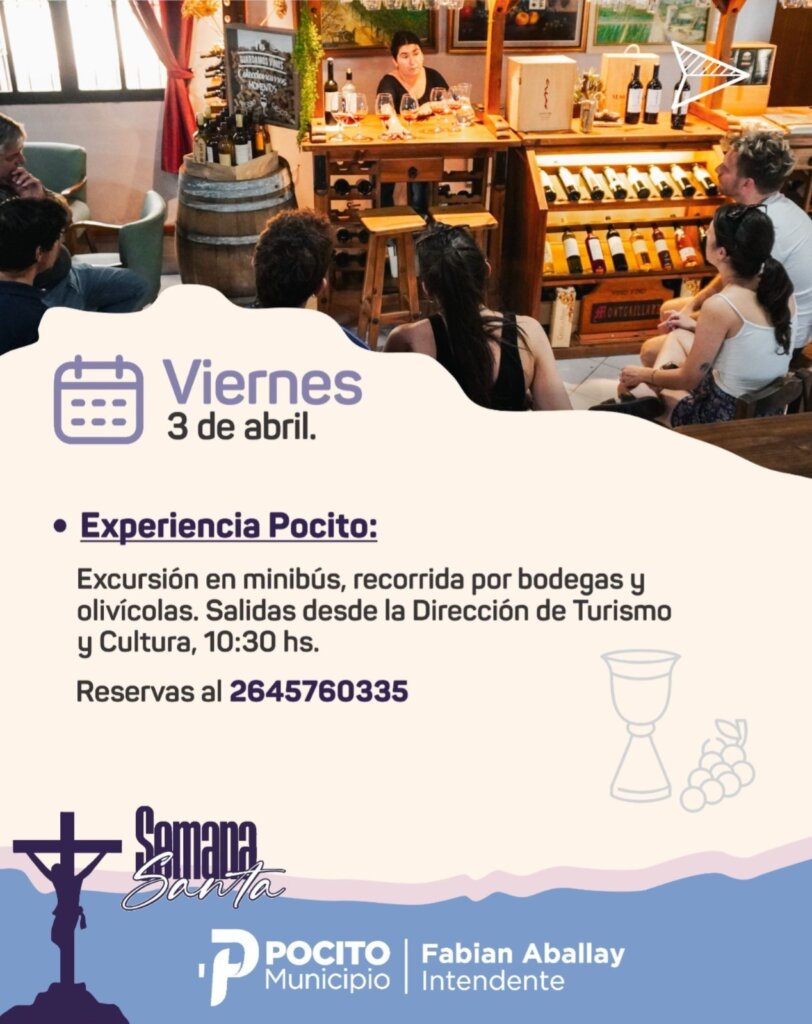 El jueves 2 está prevista una excursión en el Minibús del Municipio por las bodegas y olivícolas del departamento. Sale a las 14.30 horas de la Dirección de Turismo y Cultura frente a la plaza de Villa Aberastain. Además se desarrollará una Feria de Emprendedores y Artesanos en Finca Camuñas (ex Bodega Las Marianas), Bodega Viñas de Segisa y Olivícola La Pocitana a partir de las 11 horas.
