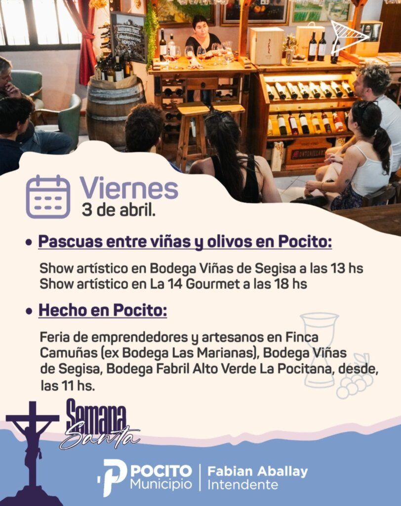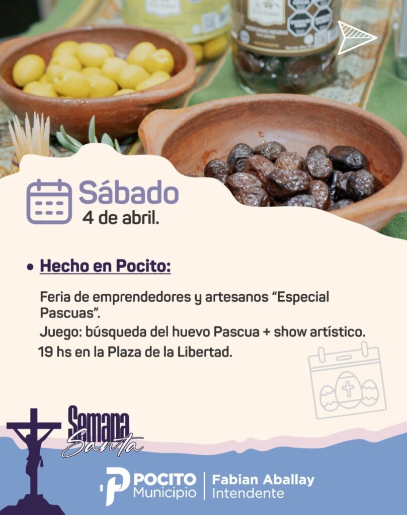 Las actividades continuarán el sábado 4 de abril con diversos shows artísticos: a las 14 horas en Finca Camuñas y en Bodega Fabril Alto Verde, mientras que en Olivícola La Pocitana a las 15 horas. En Plaza de la Libertad, a las 19 horas, se realizará la Feria de Artesanos y Emprendedores «Especial de Pascua», con variados espectáculos artísticos y «La Búsqueda del Huevo de Pascua».