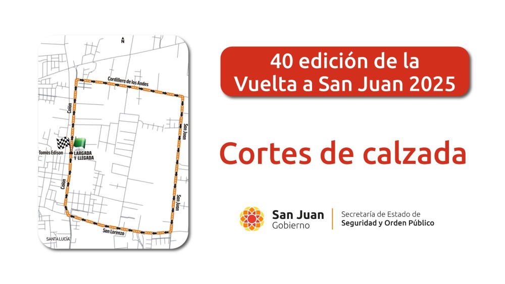 Desde el 24 de enero al 2 de febrero, la provincia celebrará la 40° edición de la Vuelta a San Juan uno de los eventos ciclisticos más relevantes del país. A partir de este viernes 24 de enero, y hasta el domingo 2 de febrero, la provincia será escenario de la 40° edición de la Vuelta a San Juan, una de las competencias de ciclismo en ruta más significativas del país. Este evento deportivo promete no solo atraer a ciclistas de renombre nacional e internacional, sino también generar un impacto significativo en la comunidad local, tanto en términos de turismo como de atención al deporte. La Secretaría de Estado de Seguridad y Orden Público, a través de la Policía de San Juan, implementará cortes de calzada a lo largo de los recorridos establecidos para garantizar la seguridad tanto de los competidores como de los espectadores. Estos cortes son una medida necesaria para controlar el tránsito y permitir el desarrollo fluido de la competencia. Las siguientes etapas se desarrollarán a lo largo de los días siguientes, abarcando diversos departamentos: Viernes 24 de enero – Prólogo Departamento: Santa Lucía. Corte total de calzada del circuito de la competencia a partir de las 15:00 horas. 17:00 horas para la convocatoria de la vuelta inclusiva en la modalidad de participativa y Competitiva. Largada 18:00 horas Participativa. Largada 19:00 horas competitiva. Finalización 20:15 horas aprox. PROLOGO DE LA VUELTA A SAN JUAN: Concentración: 20 horas, en intersección de calles Tomás Edison y Colón. Largada: 21 horas. Recorrido: por calle Colón hacia el norte hasta calle Cordillera de los Andes, al este hasta calle San Juan, al sur hasta calle San Lorenzo, al oeste hasta calle Colón, al norte hasta Línea de Meta en el mismo sitio donde fue la Largada (Colón y Tomás Edison). Sábado 25 de enero – Etapa 1 Departamentos: Capital – Sarmiento – Albardón. Concentración: 15:30 horas, en Plaza 25 de Mayo en Capital. Largada: 16:30 horas. Recorrido: en tren controlado por calle Mendoza al sur hasta Avenida Circunvalación (2 KM aprox.). Kilómetro 0 en Avenida Mendoza y Av. Circunvalación. Vía libre por calle Mendoza hacia el sur transitando el Dpto. Rawson hasta empalmar Av. Uñac (Pocito), continuar hasta Calle 11 donde se gira al este hasta Ruta 40. Al sur hasta Ruta 295 donde se gira al este hasta calle La Plata (Sarmiento), al norte hasta calle Rawson (San Martín), continuar hasta empalmar calle Nacional y girar en la rotonda hacia el oeste por calle Aguilera (Angaco), ingresar al Dpto. Albardón, calle Sarmiento hasta Ruta 40, al norte hasta ingresar al Circuito San Juan Villicum y llegar a Línea de Meta. Corte total a partir de las 14:00 hasta las 17:30 horas aproximadamente en inmediaciones de la plaza 25 de Mayo, Capital. Durante el desarrollo de la competencia se realizarán cortes transversales de manera intermitentes. Domingo 26 de enero – Etapa 2 Departamento: Sarmiento – Media Agua Concentración: 15:30 horas, en Plaza Dominguito de Media Agua. Largada: 16:30 horas. Recorrido: en tren controlado por Calle Rivadavia al oeste hasta calle José Ares, al norte hasta calle Barboza, al oeste hasta Ruta 40 donde se gira al norte y pasando las vías del tren se dará el Vía Libre (1,3 KM aprox.). Kilómetro 0 en Ruta Nacional 40 pasando vías del tren. Carrera continúa Por Ruta 40 hacia el norte hasta Calle 14 (Pocito), al oeste hasta calle Aberastain, al norte hasta Calle 11, al este hasta Av. Uñac, al norte hasta empalmar calle Mendoza (Rawson) hasta calle República del Líbano, al oeste hasta Av. España, al norte hasta girar al oeste en Av. Circunvalación, ingresar al anillo transitando los Dptos de Capital, Rivadavia, Santa Lucía y salir en Acceso Sur Ruta 40 en dirección al Dpto. Pocito. Por Ruta 40 hacia el sur hasta calle Uruguay (Sarmiento) donde se gira al este hasta Av. 25 de Mayo, al norte hasta calle Rivadavia, al oeste hasta Línea de Meta, frente a Plaza de Media Agua. Corte total en inmediaciones de Plaza de Media Agua, Sarmiento y el recorrido de la competencia a partir de las 14:30 horas hasta finalizar. Lunes 27 de enero – Etapa 3 Departamento: Rivadavia. Concentración: 15:30 horas, en Avenida Libertador General San Martín frente a Complejo Científico Forense. Largada: 16:30 horas. Recorrido: Por Av. Lib. Gral. San Martín hacia el oeste hasta calle Teniente Galíndez, al norte hasta la rotonda y girar al oeste por Ruta 60 hasta rotonda frente al Parque Faunístico donde se retorna por carril opuesto hasta calle Galíndez, Av. Lib. Gral San Martín hasta Línea de Meta en carril frente al punto de Largada. Cabe destacar que se implementará un corte total de las calzadas del recorrido a partir de las 12:00 horas. Se recomienda a la comunidad del Departamento de Ullúm dirigir sus trayectos, en la medida de lo posible, por el departamento Zonda para evitar inconvenientes. Martes 28 de enero – Etapa 4 Departamentos: Capital – Sarmiento. Concentración: 15:30 horas, en Avenida José Ignacio de la Rosa y calle Caseros, frente a Municipalidad de la Ciudad de San Juan. Largada: 16:30 horas. Recorrido: en tren controlado por Av. Ignacio de la Roza hacia el este hasta Av. Rawson, al sur hasta calle 9 de Julio, al este hasta Puente Av. Circunvalación donde se dará el Vía Libre: 1,800km. Kilómetro 0 en Calle 9 de Julio y Puente Av. Circunvalación. Carrera continúa por calle 9 de Julio hacia el este, Av. Hipólito Yrigoyen (Santa Lucía) hasta Acceso Este Ruta 20, pasando por Aeropuerto Domingo Faustino Sarmiento (9 de Julio), puente Río San Juan, hasta calle La Plata (Caucete), al sur hasta Ruta 241, al este hasta Ruta 270 (25 de Mayo), al sur hasta Calle 10, al oeste hasta calle La Plata, al sur hasta Ruta 295 (Sarmiento), al oeste hasta Ruta 162, al sur hasta Ruta 319, al este hasta calle Bufano, al norte hasta Ruta 295, al oeste hasta Ruta 162, al sur hasta calle Barboza, al oeste hasta Ruta