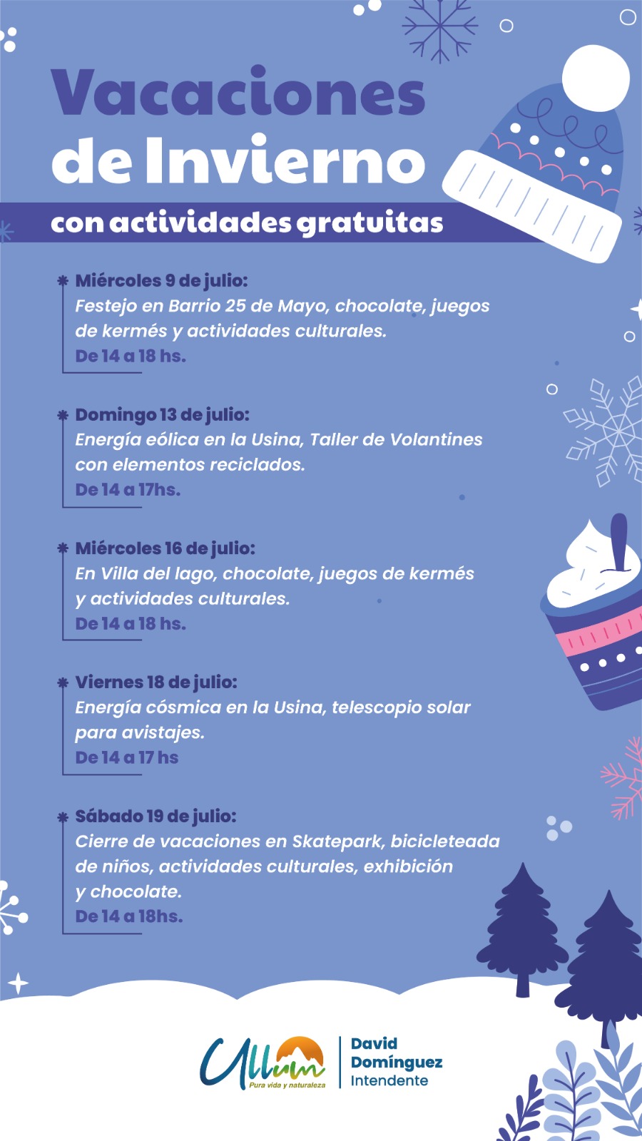 Los barrios, el Skatepark y la Usina son los espacios en los que la municipalidad invita a disfrutar como chicos de juegos de kermés, chocolate y buena energía. La Municipalidad de Ullum invita a disfrutar unas vacaciones de invierno inolvidables con una agenda llena de propuestas culturales, recreativas y educativas, totalmente gratuitas. Cada jornada está pensada para compartir en familia, aprender sobre energías renovables y divertirse. Grilla de actividades: Miércoles 9 de julioFestejo en el Barrio 25 de Mayo con chocolate caliente, juegos de kermés y actividades culturales para todas las edades.Horario: de 14 a 18 hs. Domingo 13 de julioTaller de Volantines en la Usina, en el marco de la propuesta «Energía Eólica», con creación de barriletes a partir de elementos reciclados. Traé tu bolsa de polietileno, friselina o papel.Horario: de 14 a 17 hs. Miércoles 16 de julioEncuentro en Villa del Lago con juegos de kermés, títeres y payasos, propuestas culturales y chocolate para compartir.Horario: de 14 a 18 hs. Viernes 18 de julioPara aprender sobre la “Energía Cósmica” en la Usina: observación solar con telescopios y charlas astronómicas.Horario: de 14 a 17 hs. Sábado 19 de julioCierre de vacaciones con una gran jornada en el Skatepark. Habrá bicicleteada infantil, actividades culturales, exhibiciones y chocolate con sopaipillas para celebrar el cierre.Horario: de 14 a 18 hs. Todas las actividades son libres y gratuitas.